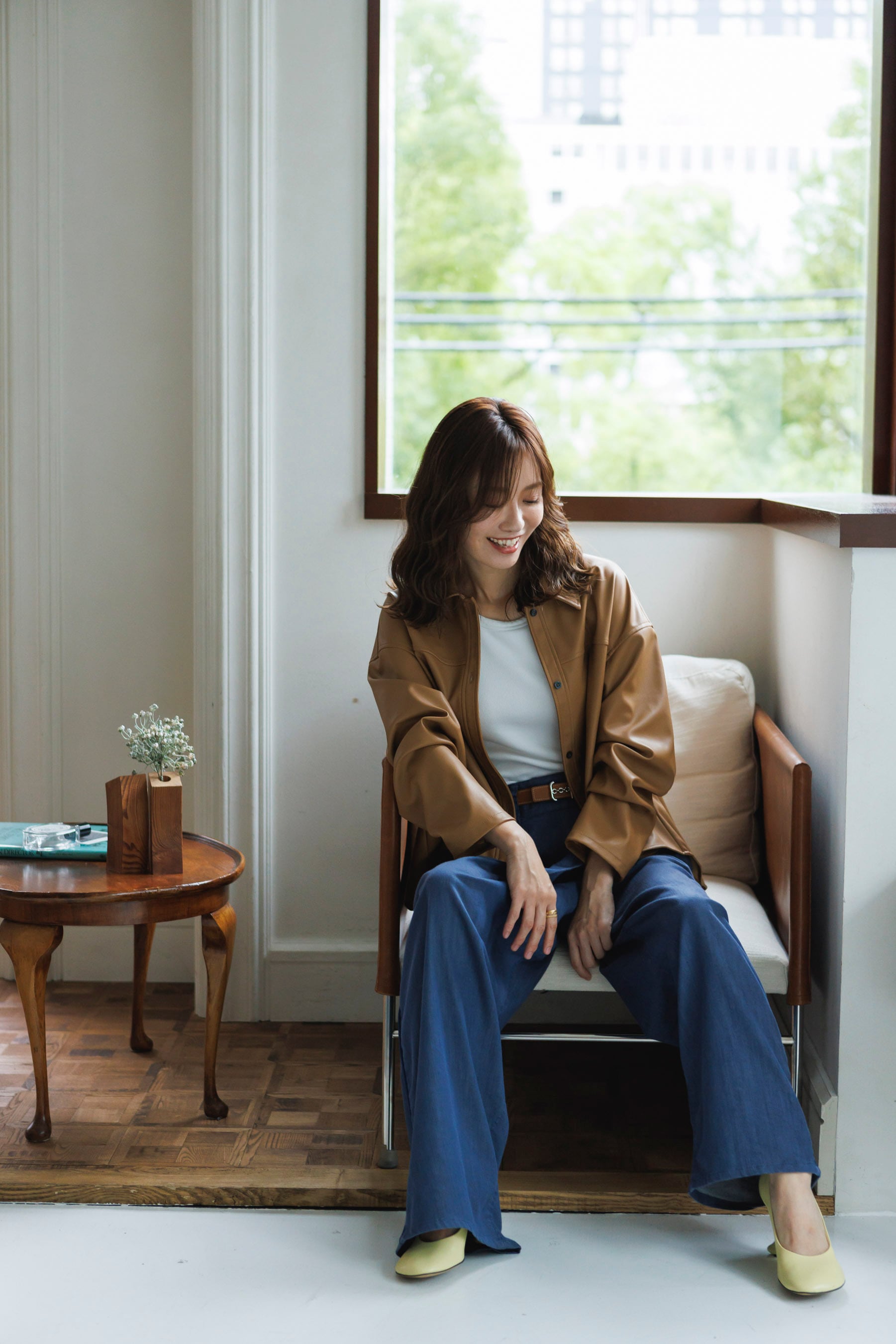 落ち感のあるレザー調素材を使用し、ハードすぎず大人の女性らしい柔らかさを演出。