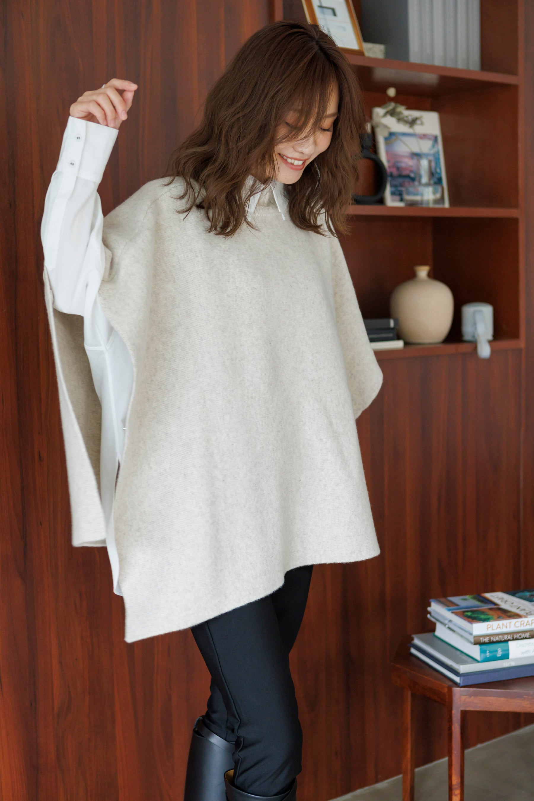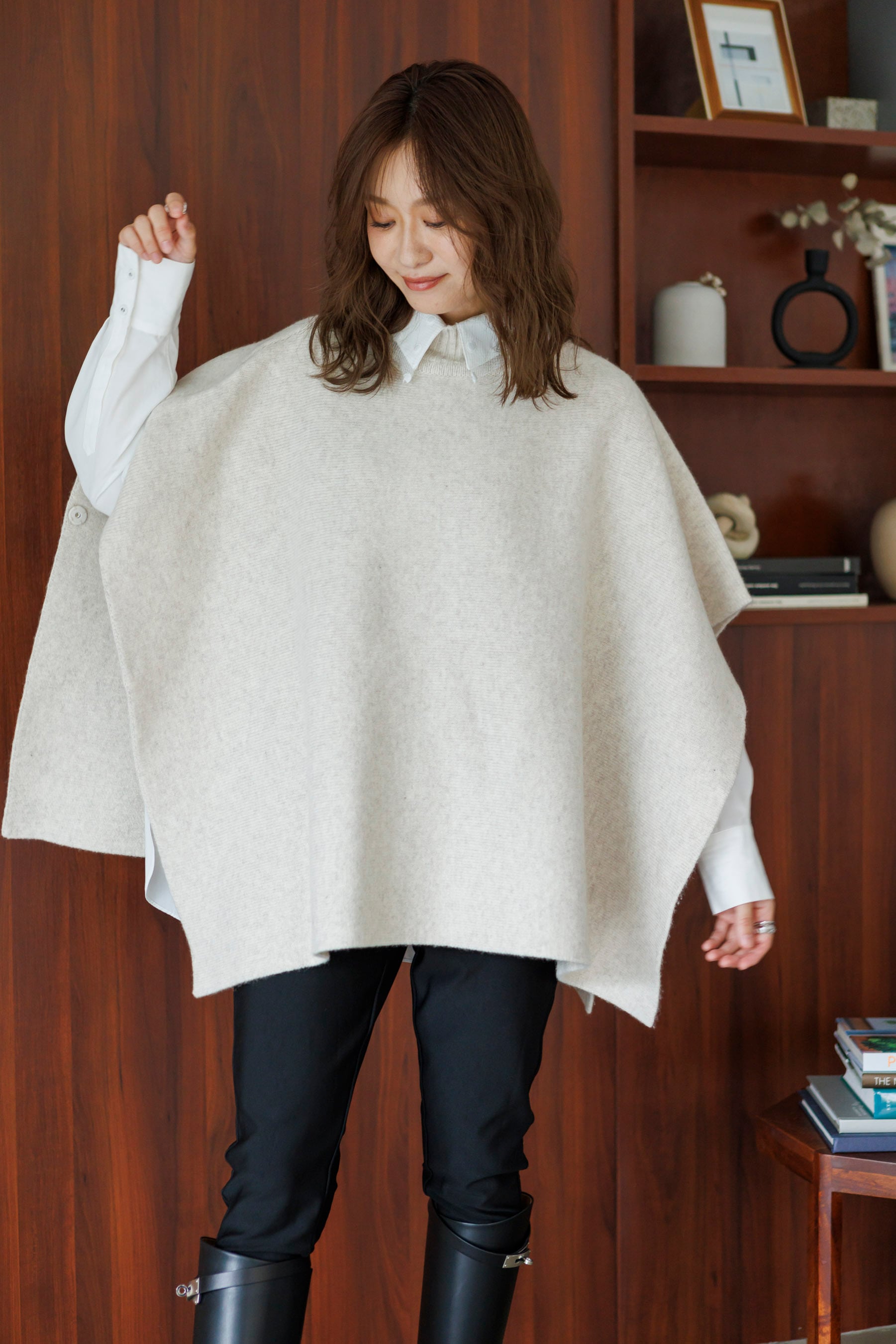洗練されたフォルムと上質な素材感が魅力のニットポンチョ。