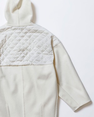 バックスタイルまで可愛いフード付きのキルティングコートです。