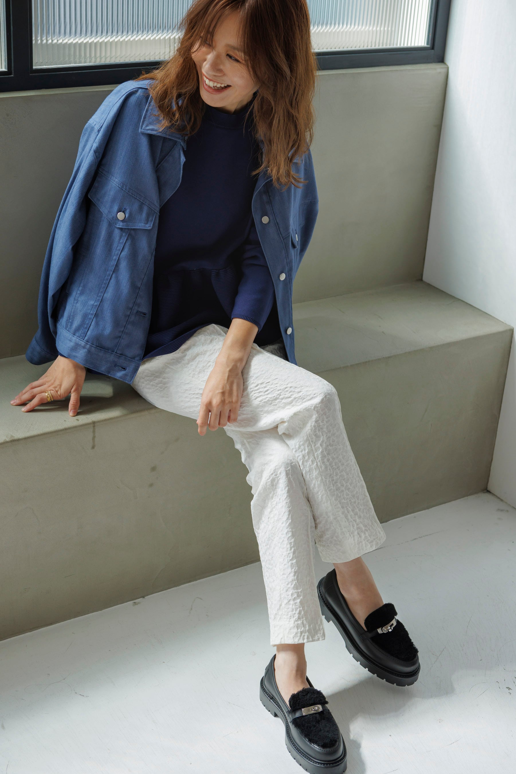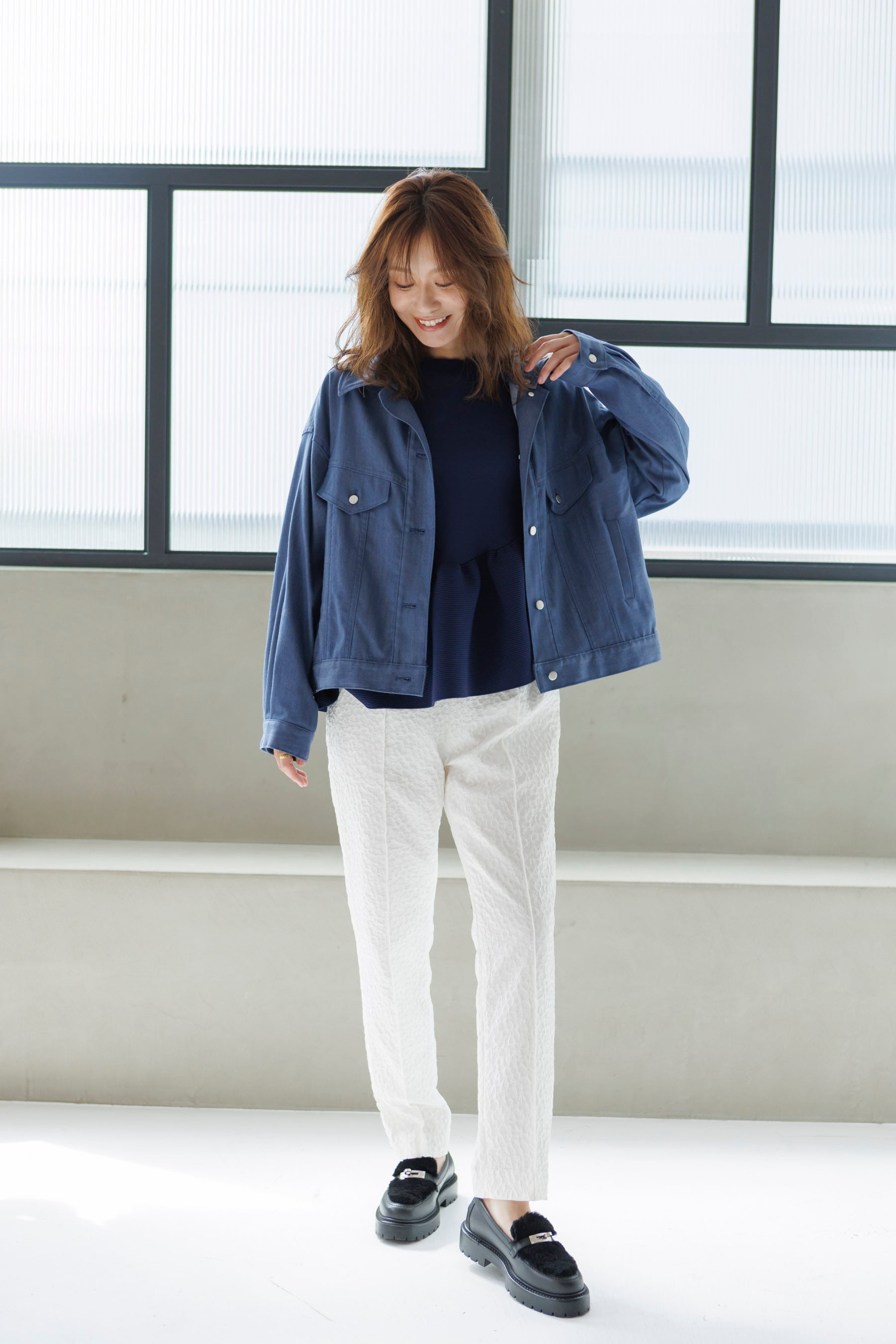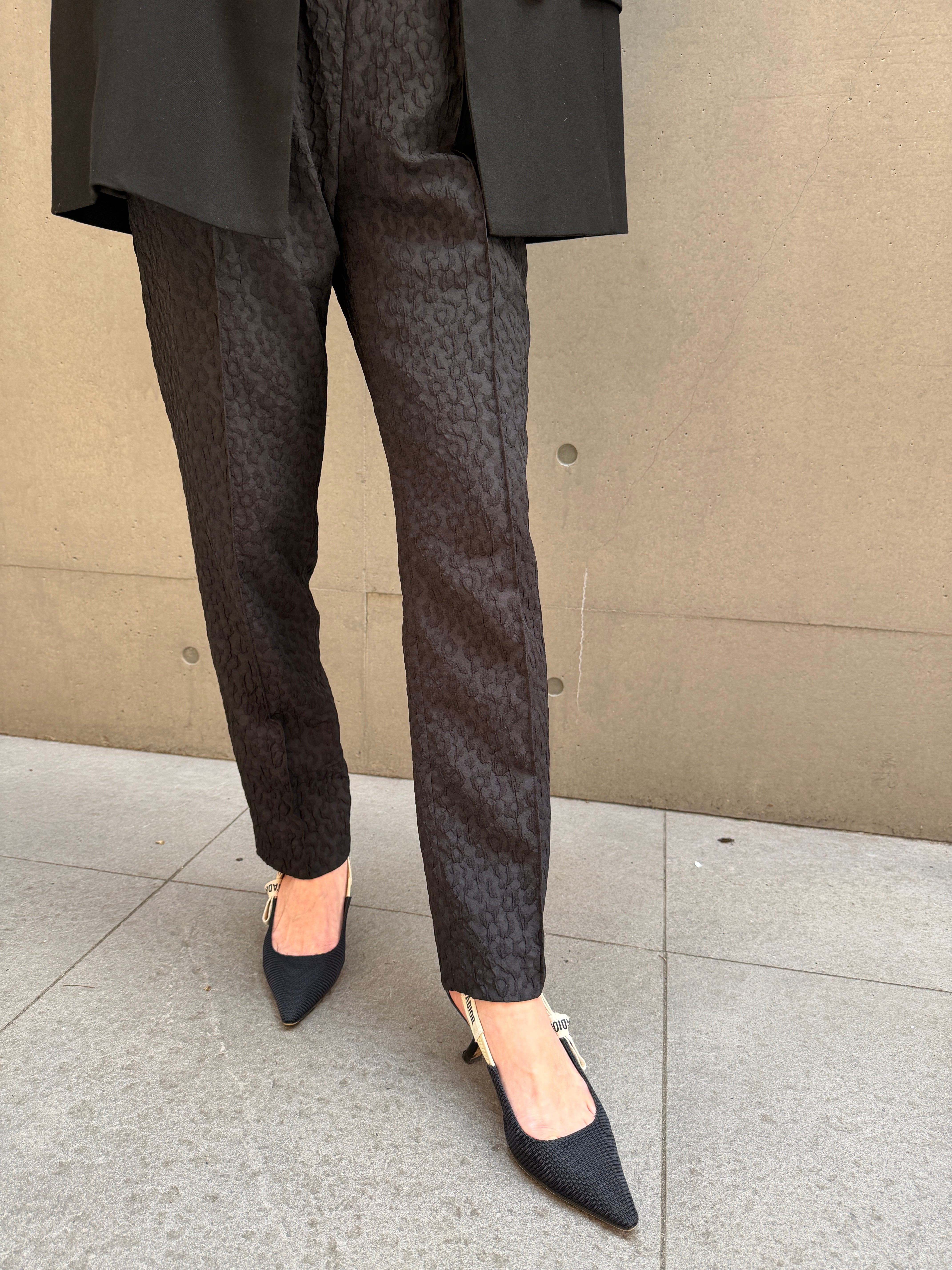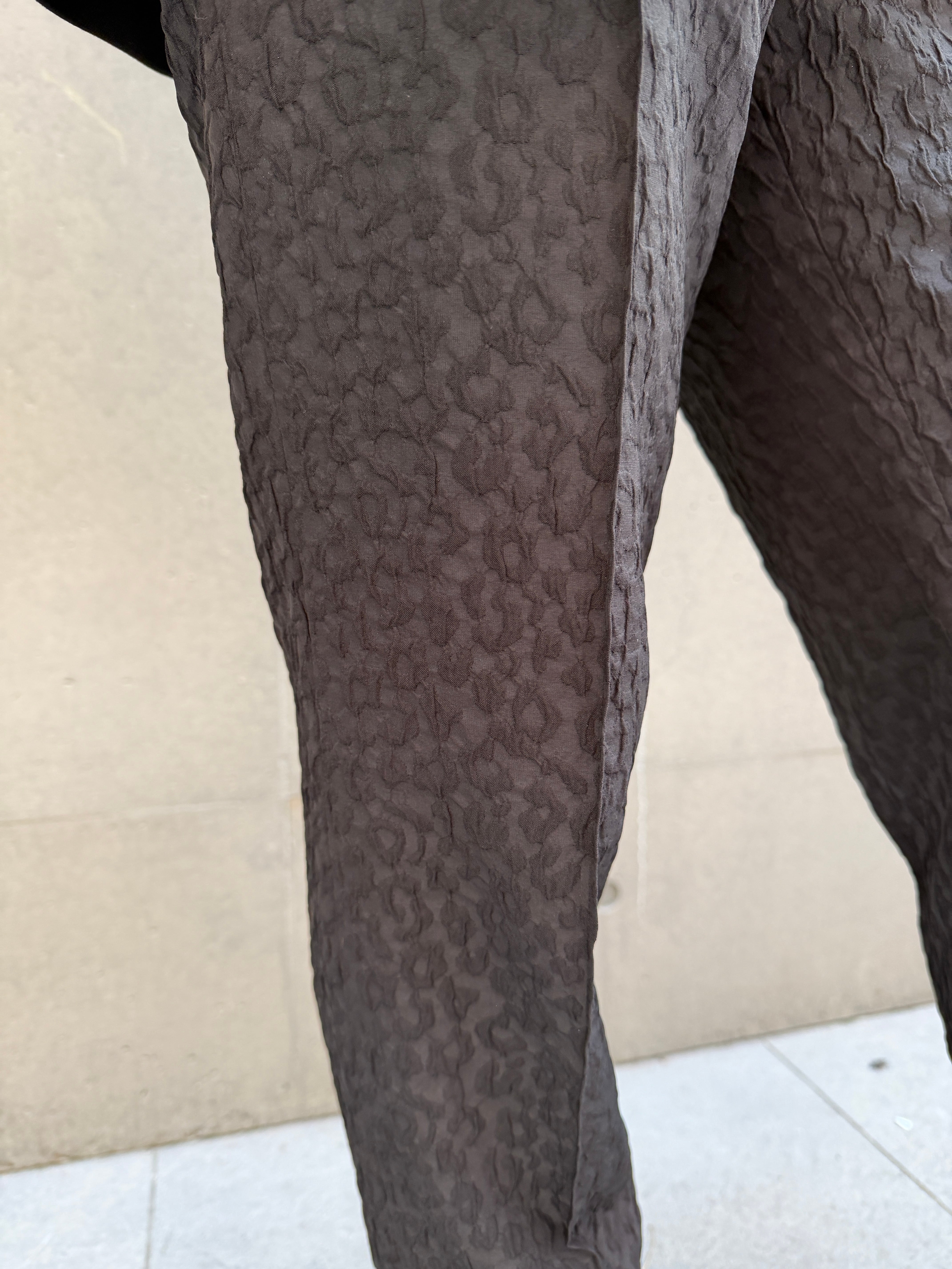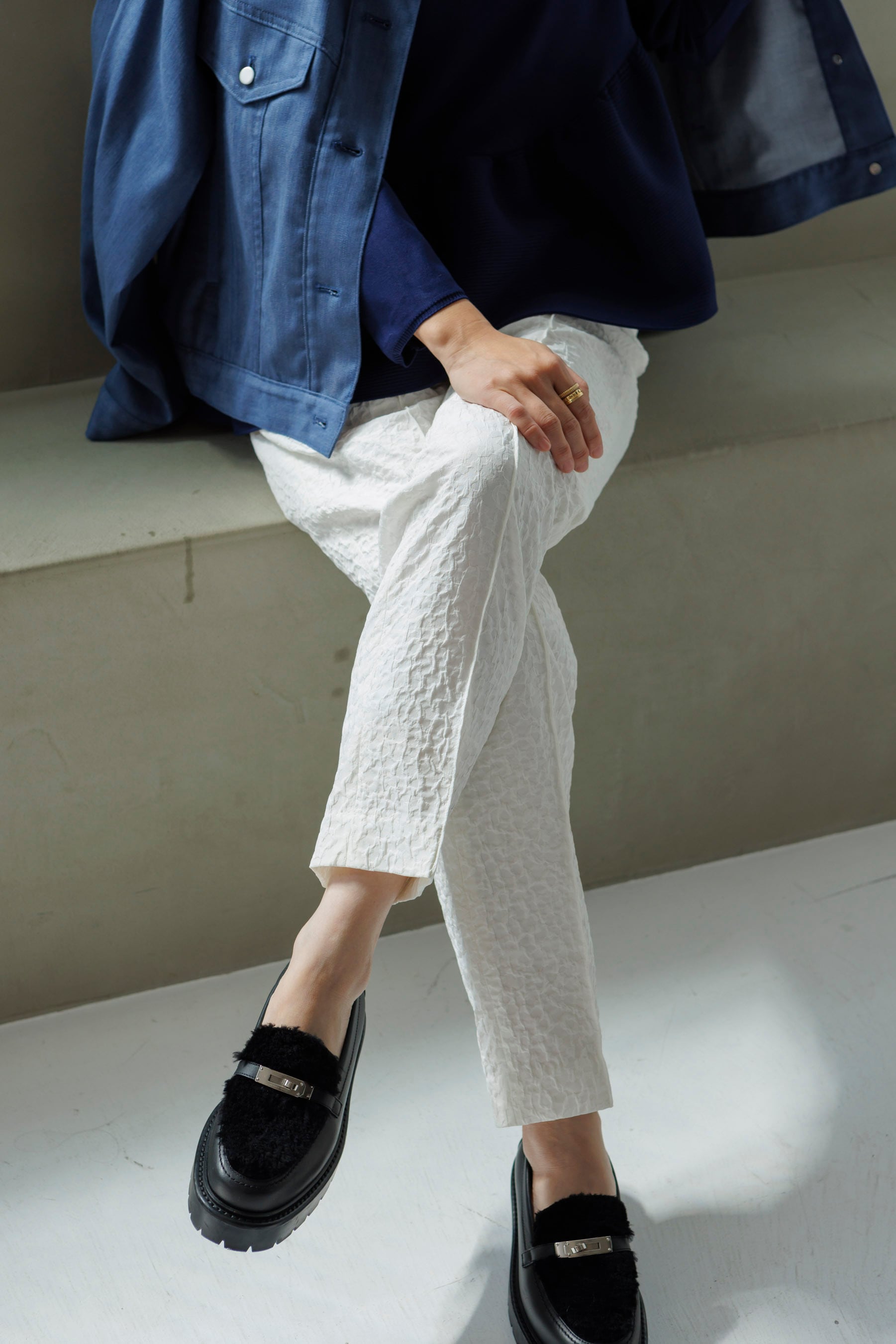 軽やかな素材で動きやすく、シンプルなデザインながらもジャガードが立体感と上品な雰囲気を兼ね備えたパンツです。