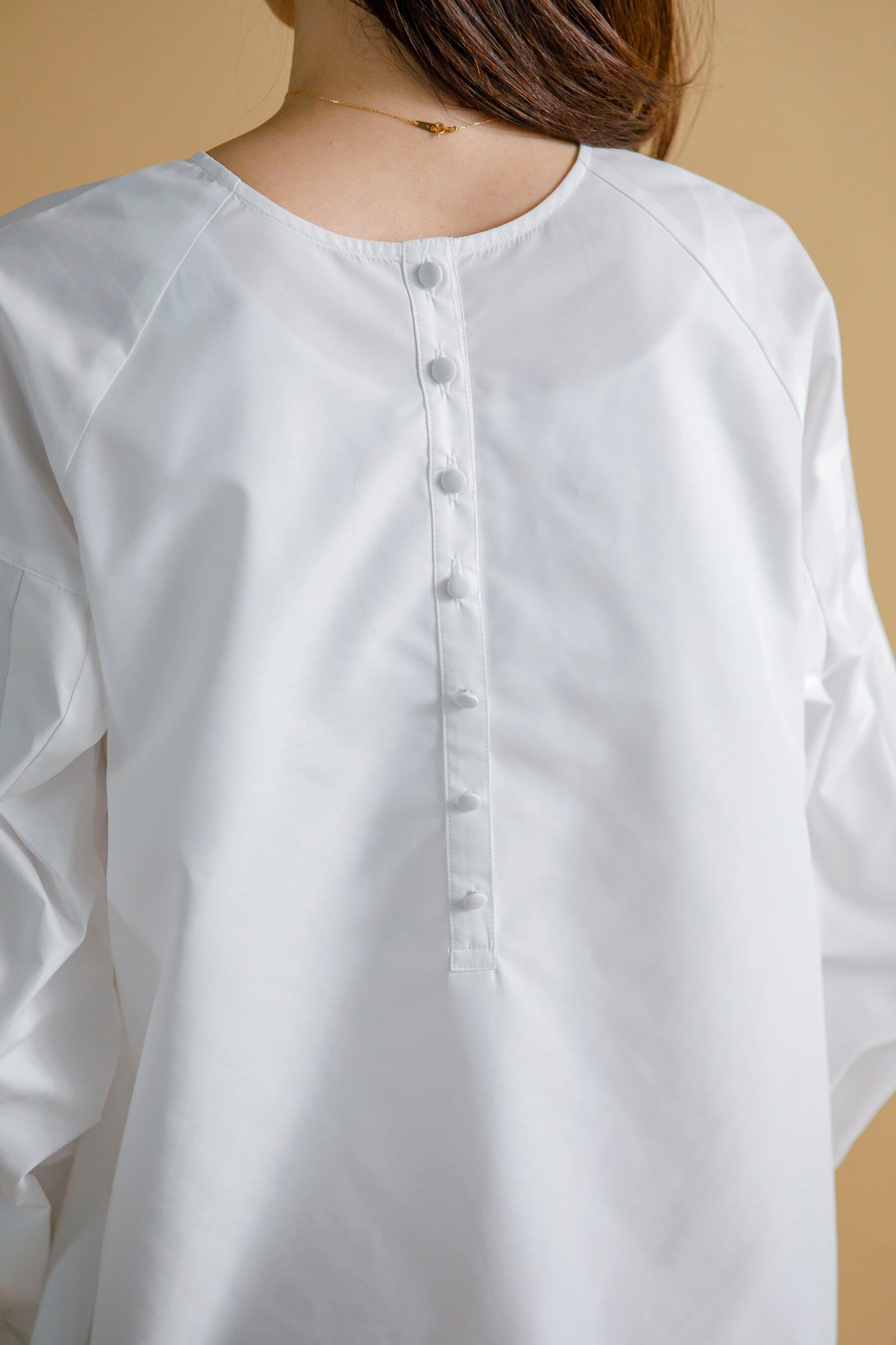 くるみボタンが可愛いボタンデザインと、ラグラン線がシャープに見せてくれる前後2way仕様なのでその日の気分や、合わせるボトムスでスタイリングを変えられます。