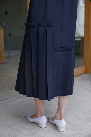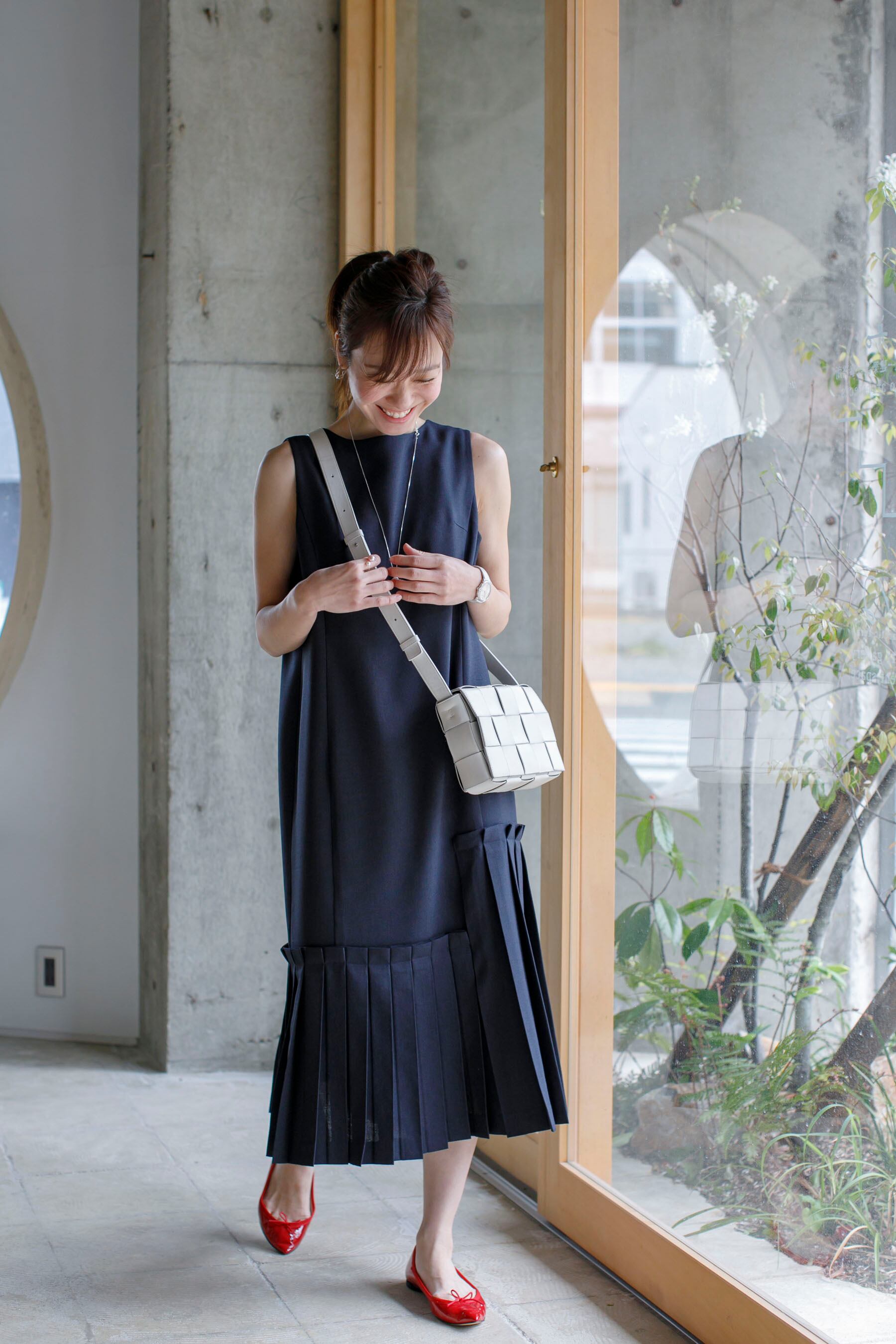 裾のアシンメトリーで仕上げたプリーツが綺麗目すぎず女性らしさを醸し出す一枚。