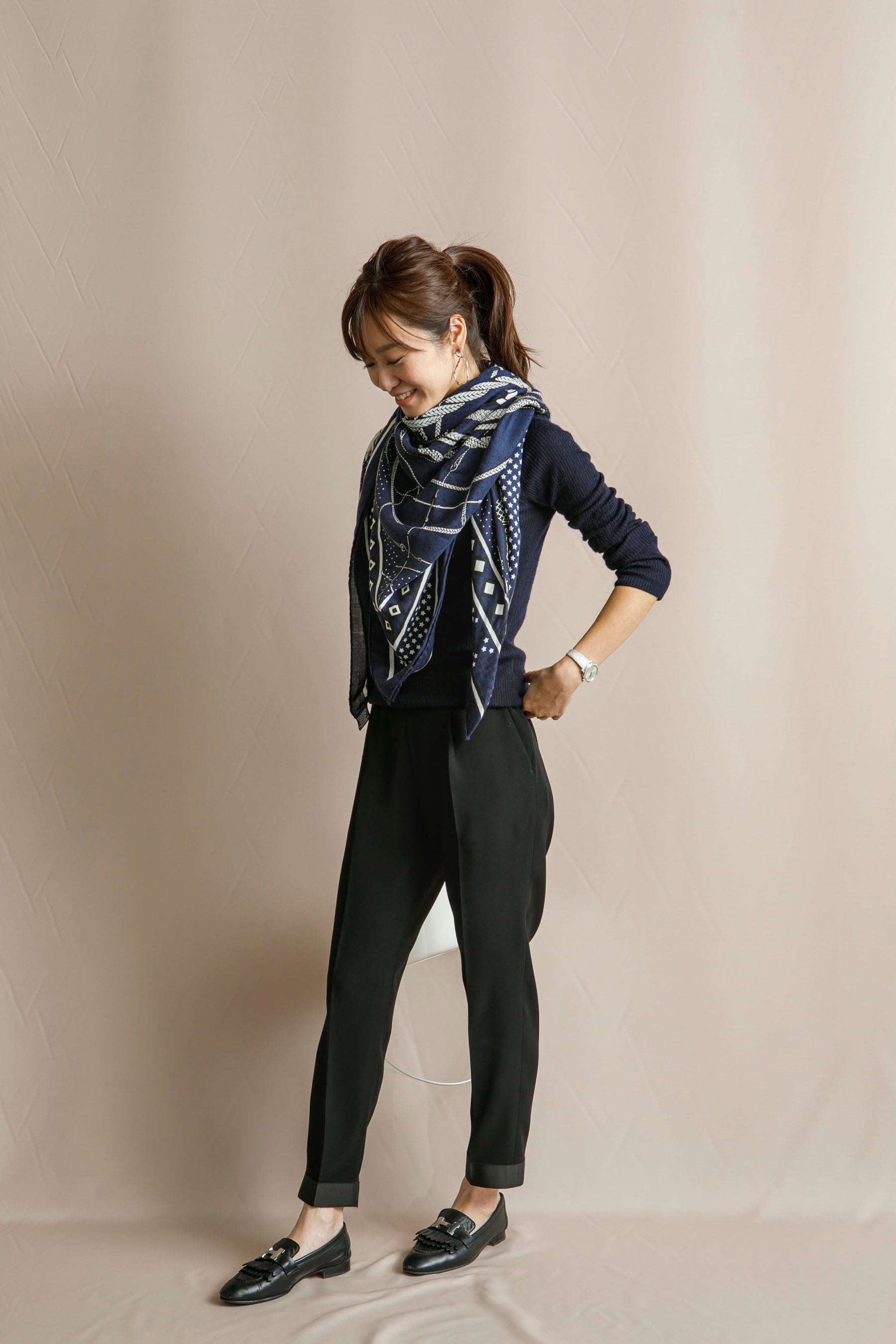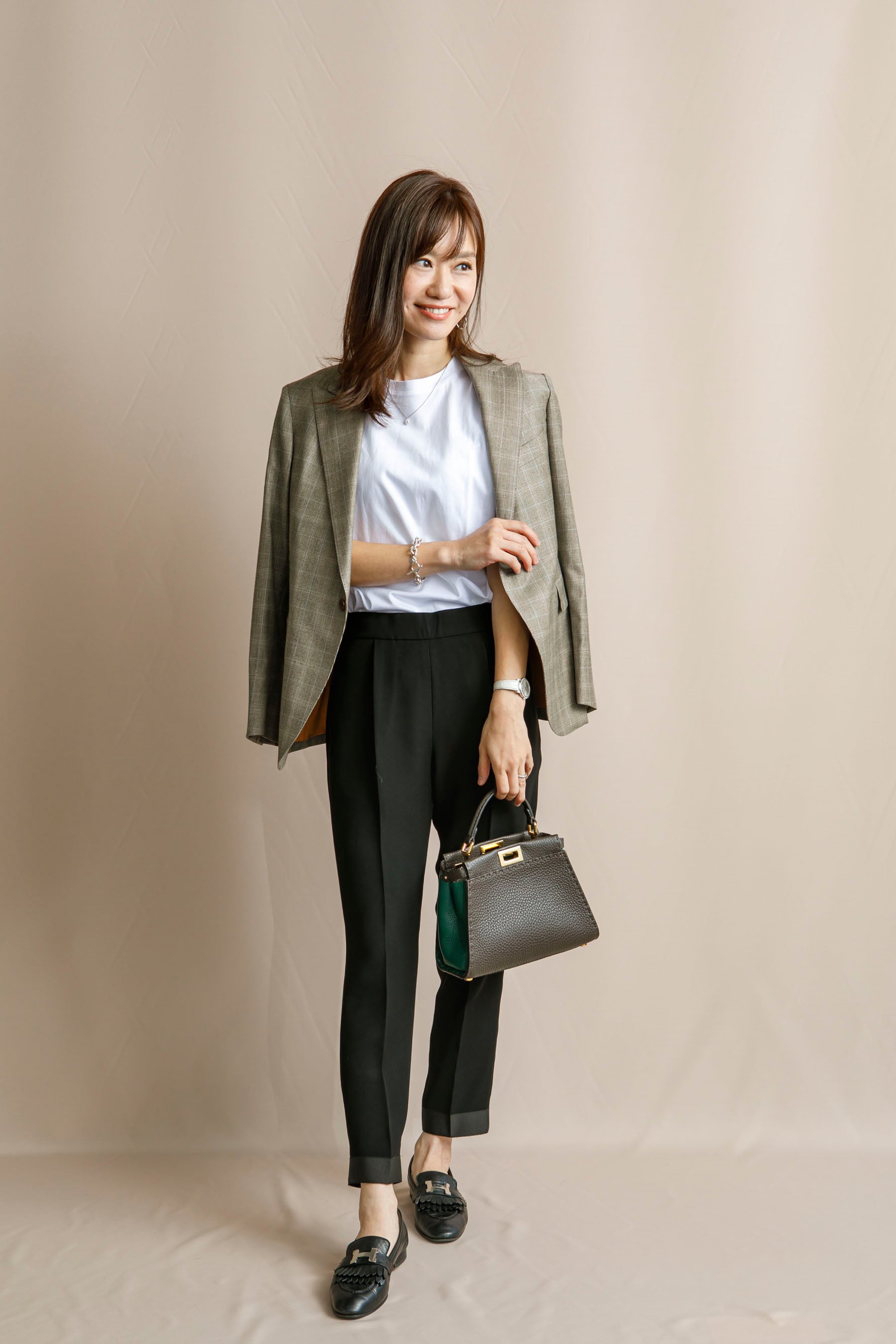ジャケット、ニット、ブラウスにも。どんなトップスにも合わせやすい定番のテーパードパンツ。
