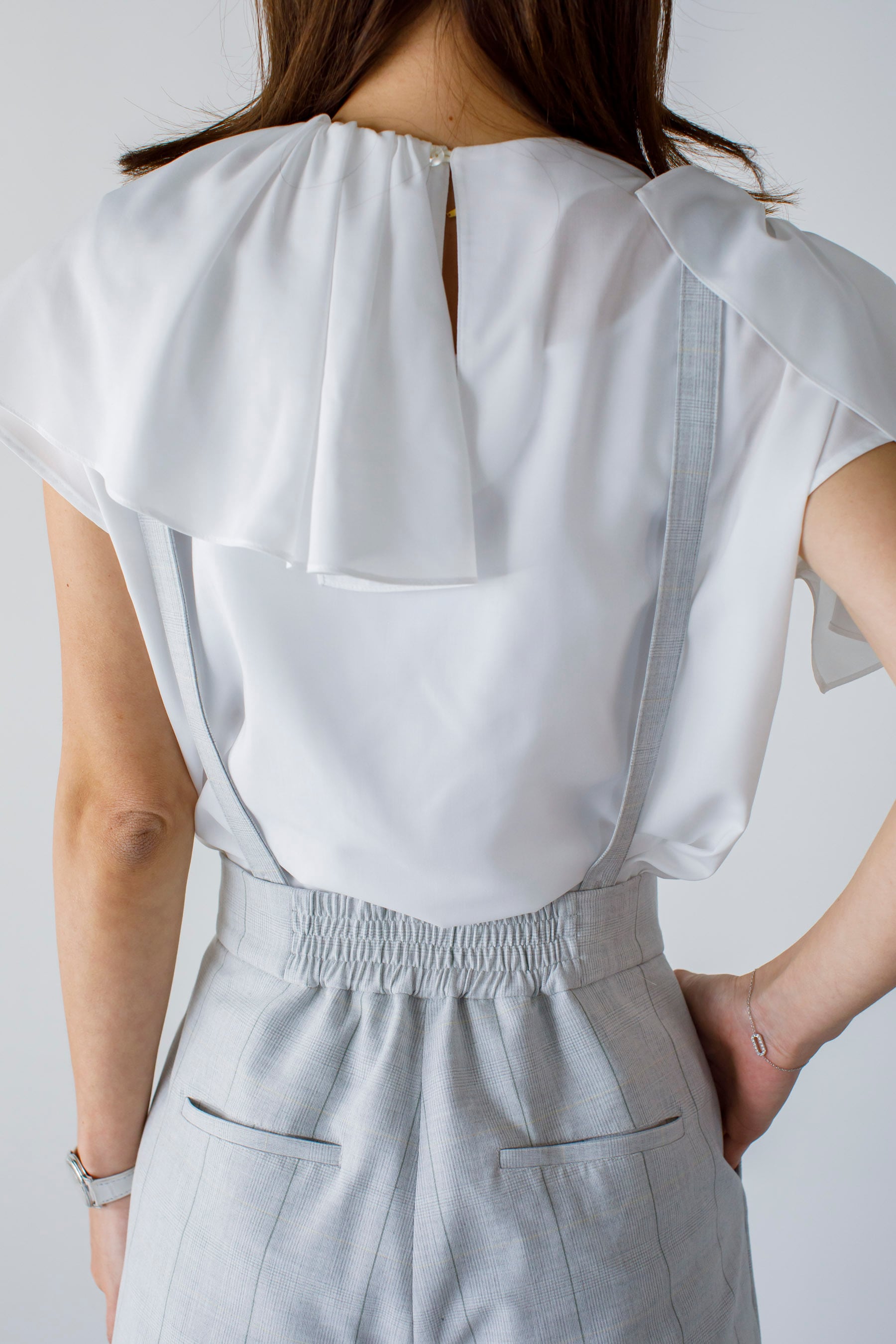 やわら可愛いチェック柄が目を引くサスペンダー付きワイドパンツ。