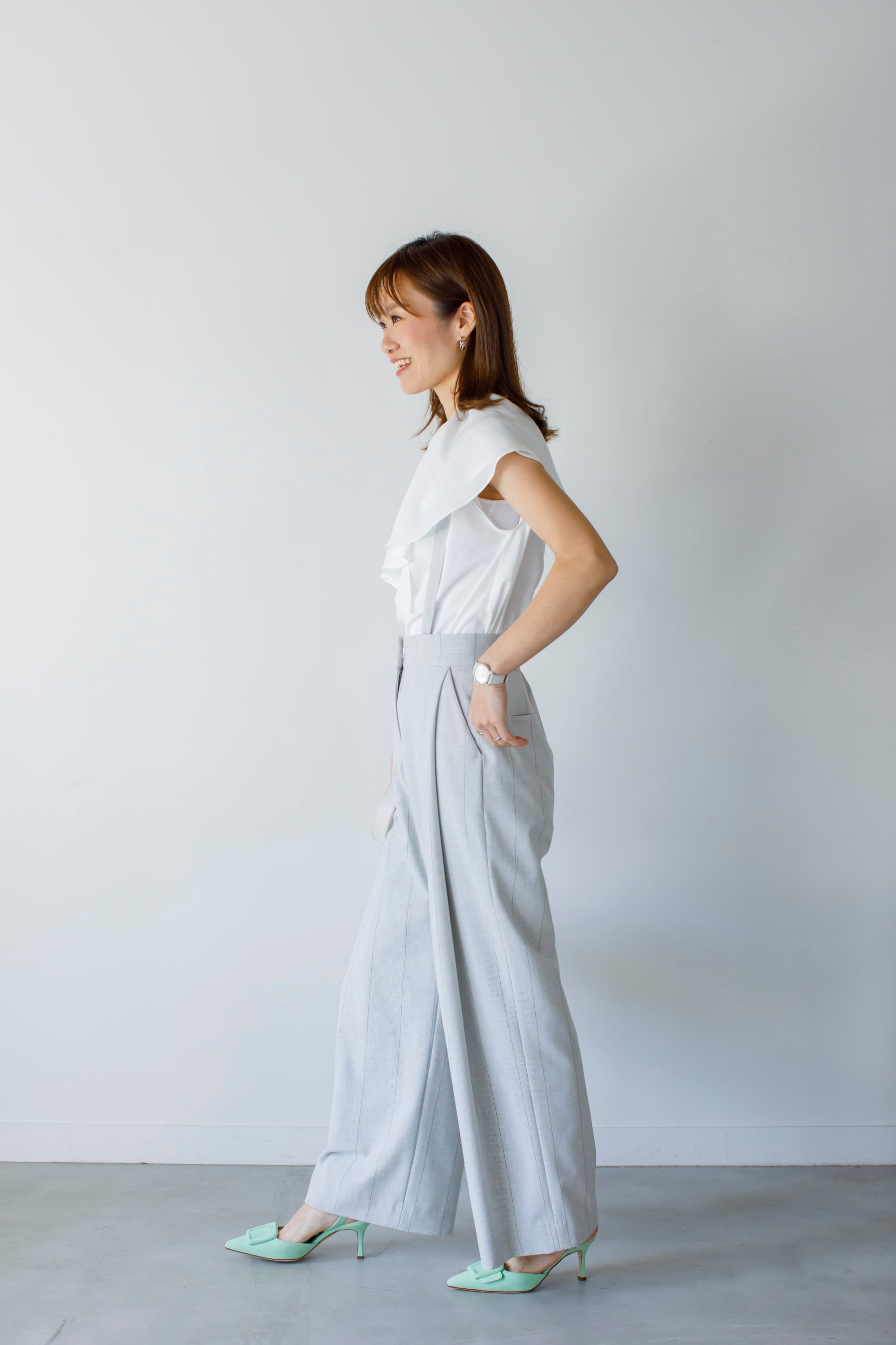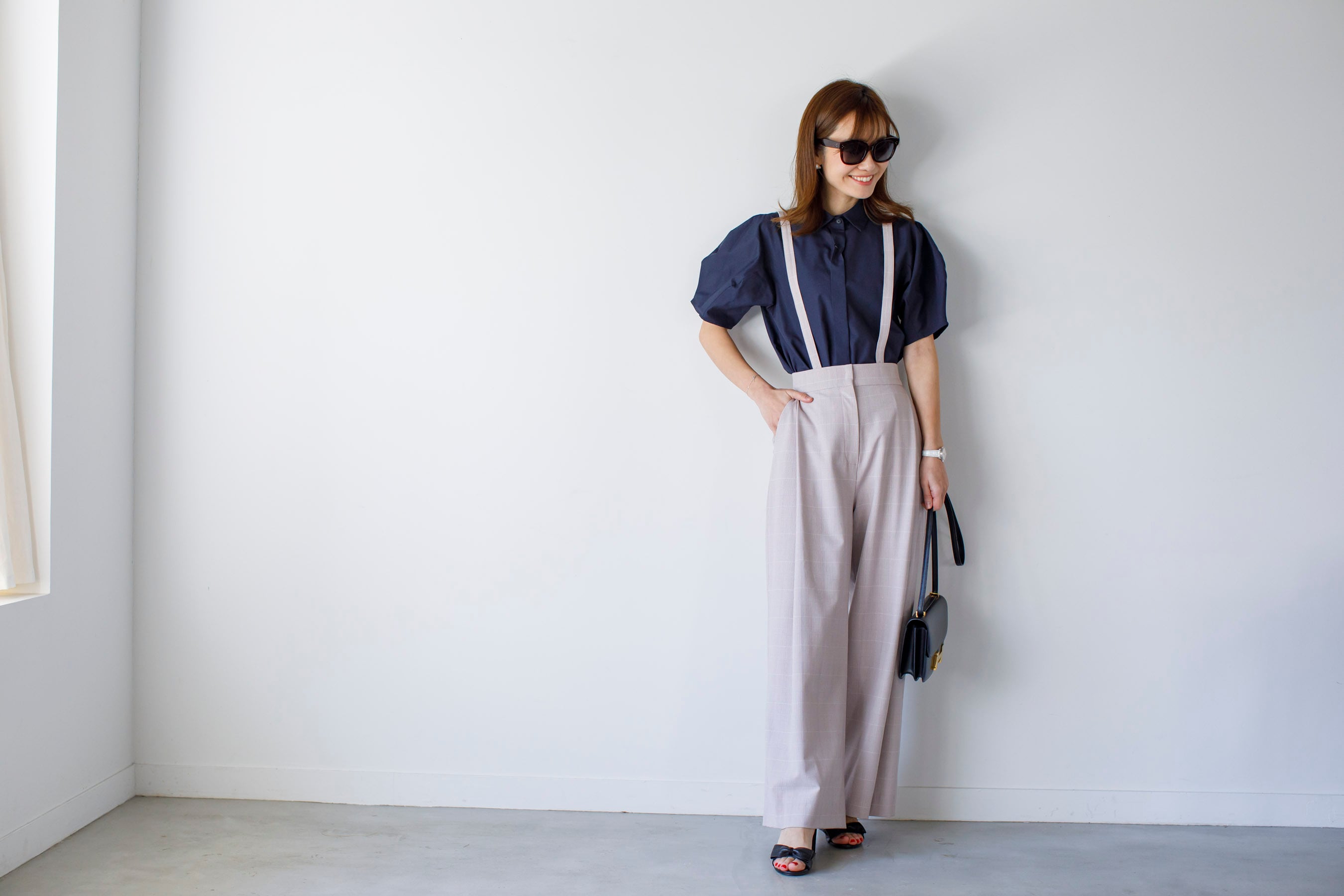少しハイウェストで、太めのベルトの切り替えがウェスト周りをすっきり見せてくれます。