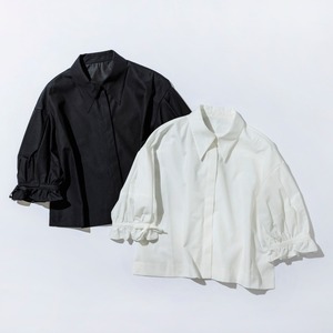 今年らしく女性らしいシルエットが魅力的なショート丈ブラウス。ふんわり膨らんだ袖と、すっきりとした襟元がポイントです。羽織として着ても可愛い万能ブラウス。
