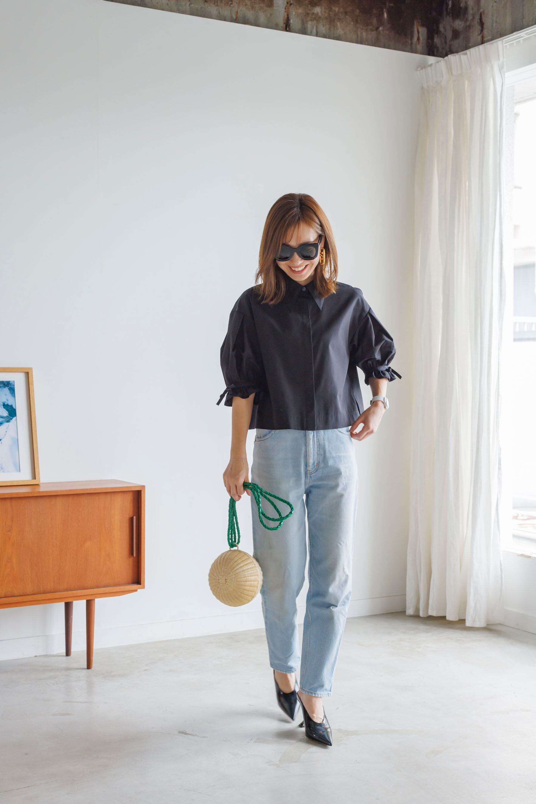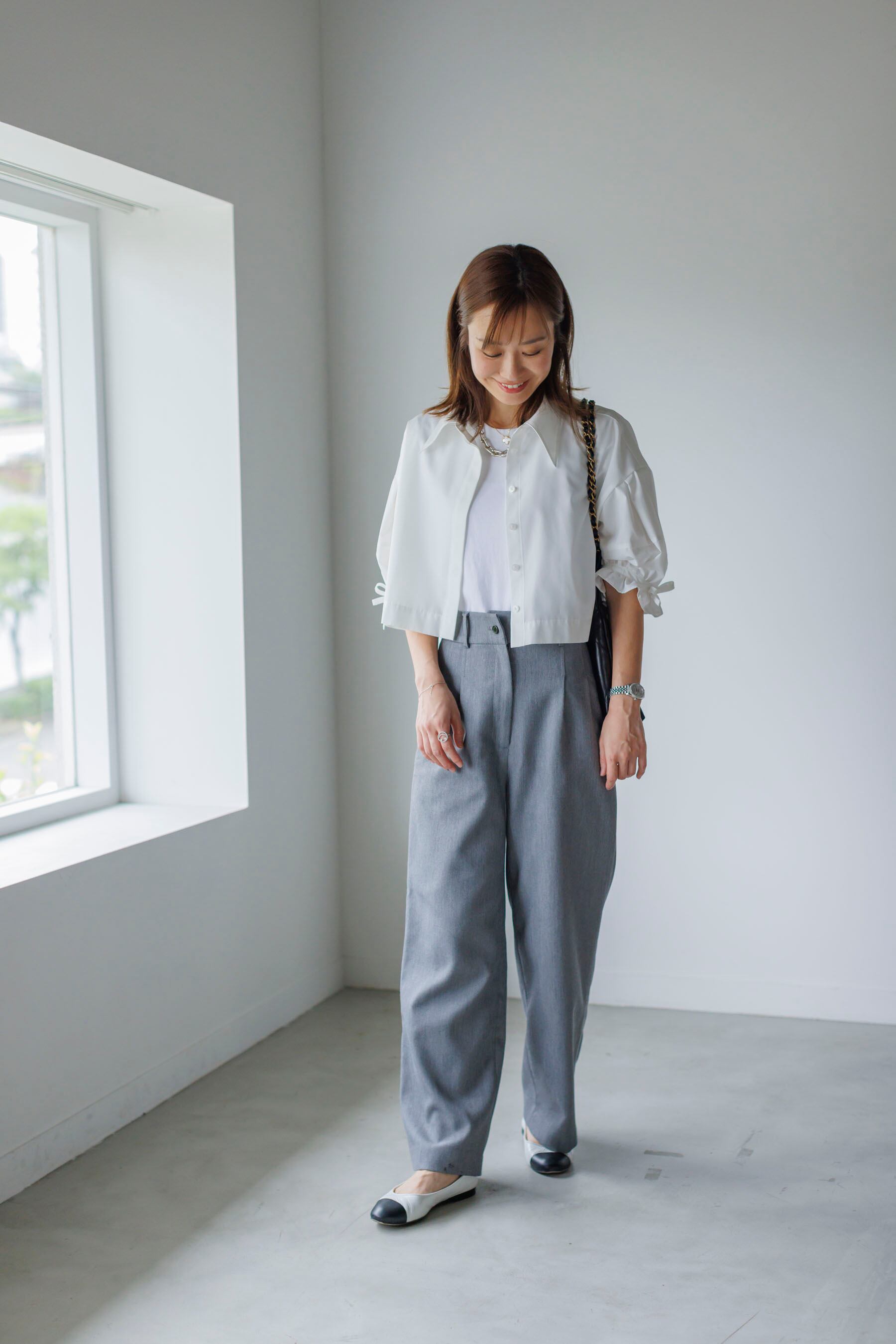 今年らしいショート丈ブラウスを、スカートやワイドパンツなど色々なボトムスに合わせて