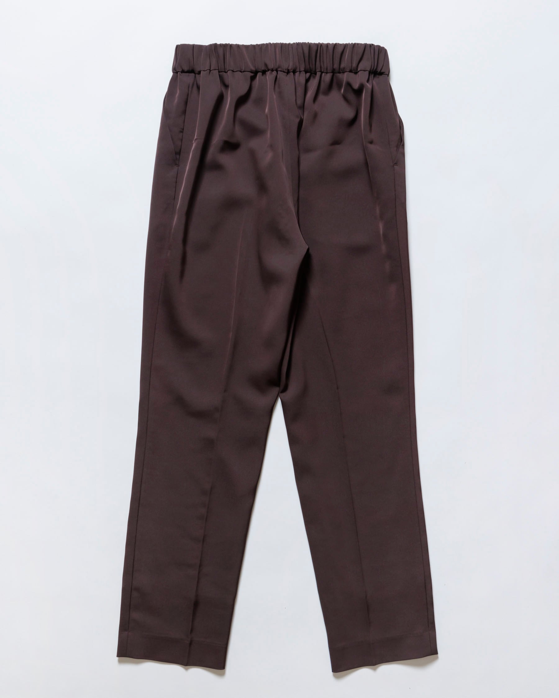 すっきりとしたテーパードシルエットで、ウエストゴムのリラクシーな着心地と肌離れの良い素材がストレスフリー。