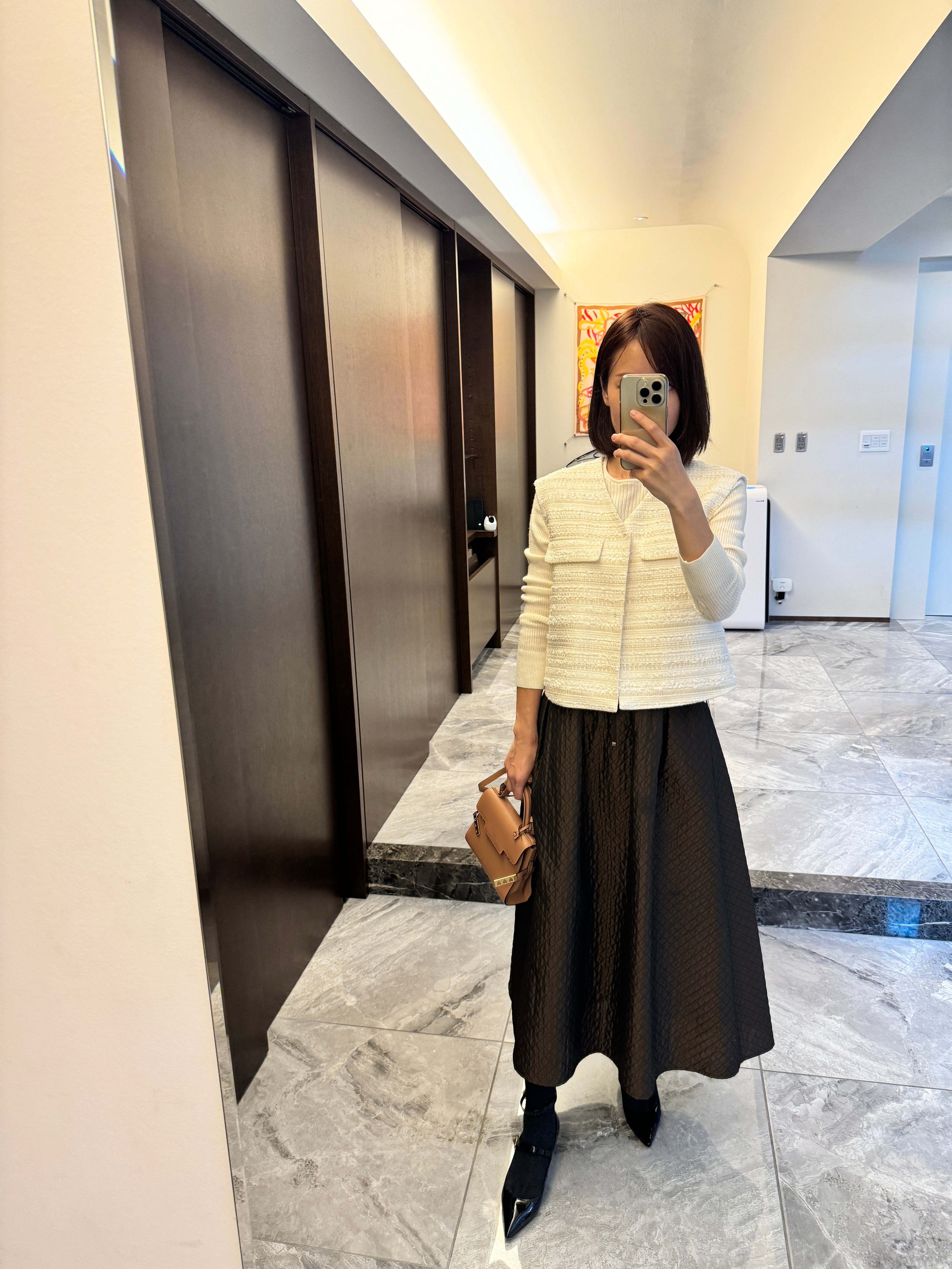 スタイリッシュなショート丈は、脚長効果も期待でき、全体のバランスを引き締める一方、ツイードならではの温かみと高級感をプラスしてくれます。