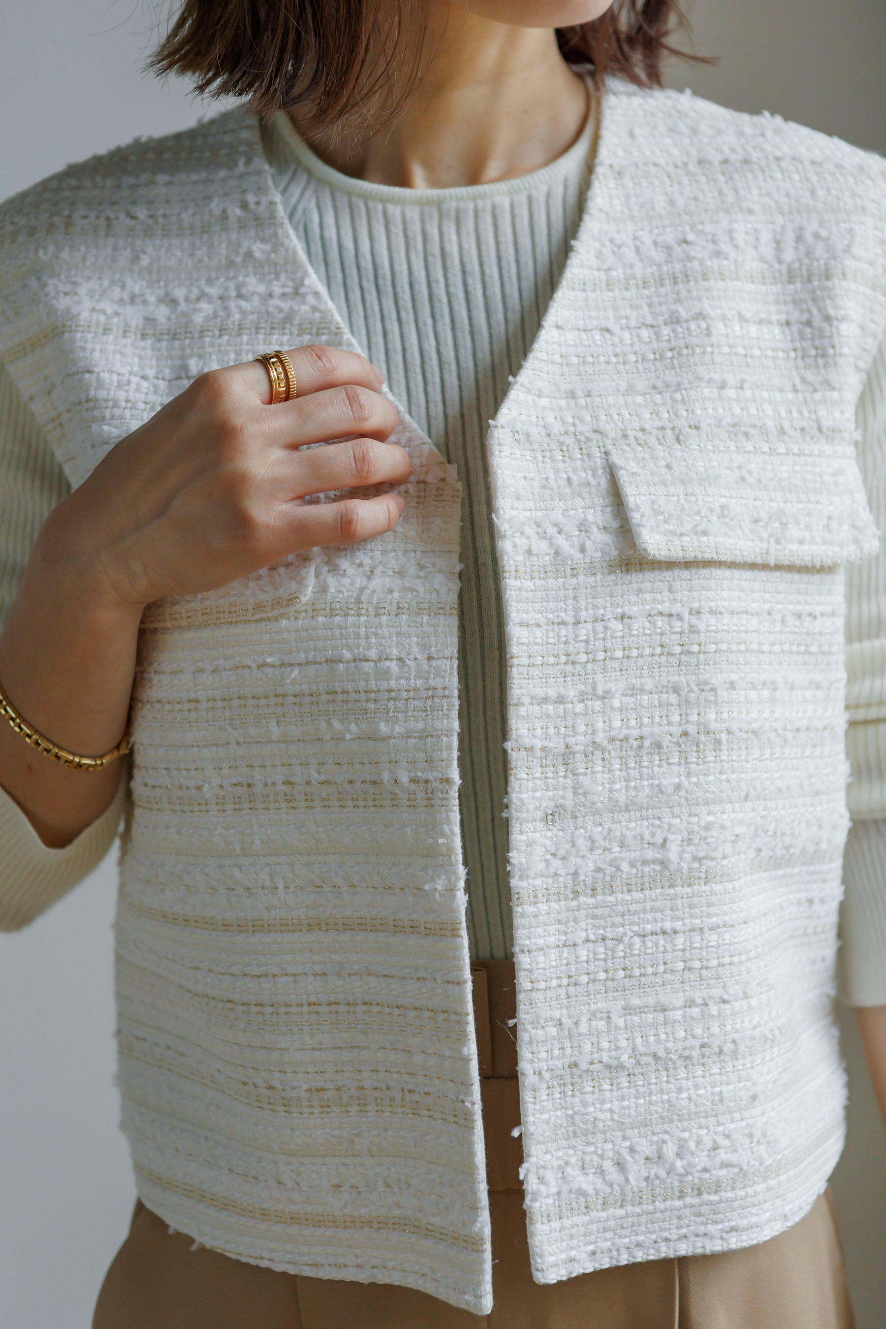 高級感のあるツイードジレに仕上げています。